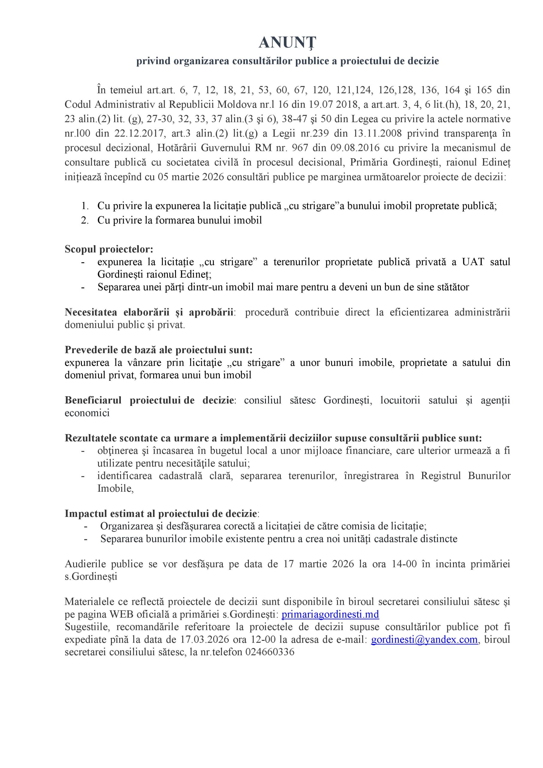 Primăria s.Gordinești, r-ul Edineț anunță pentru data 10.03.2026, ora 10-00, în incinta primăriei desfășurarea licitației publice […]
